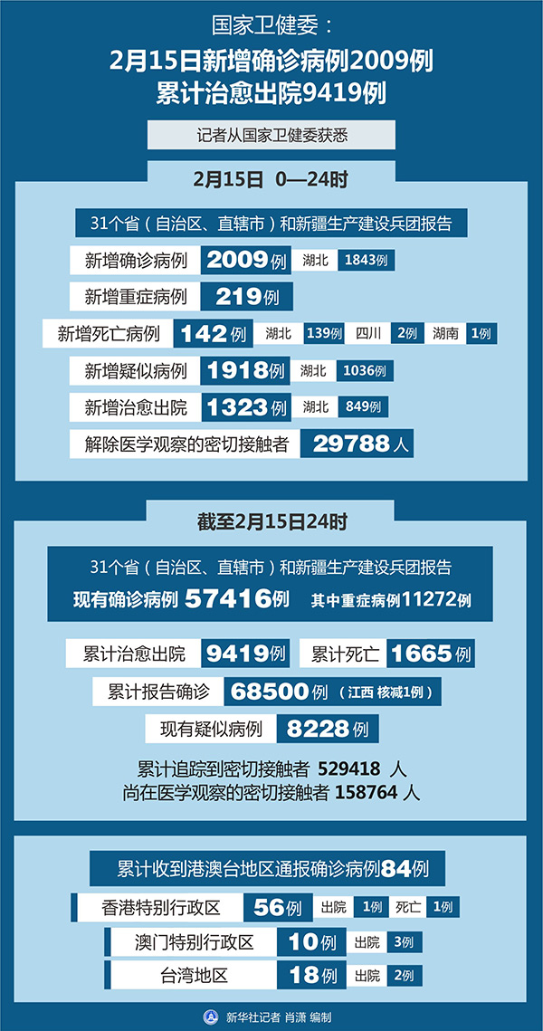 截至2月15日24時,據(jù)31個?。ㄗ灾螀^(qū)、直轄市)和新疆生產(chǎn)建設(shè)兵團報告,現(xiàn)有確診病例57416例(其中重癥病例11272例),累計治愈出院病例9419例,累計死亡病例1665例,累計報告確診病例68500例(江西省核減1例),現(xiàn)有疑似病例8228例。累計追蹤到密切接觸者529418人,尚在醫(yī)學觀察的密切接觸者158764人。