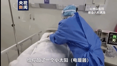 醫(yī)護(hù)人員站在病床邊俯下身說: