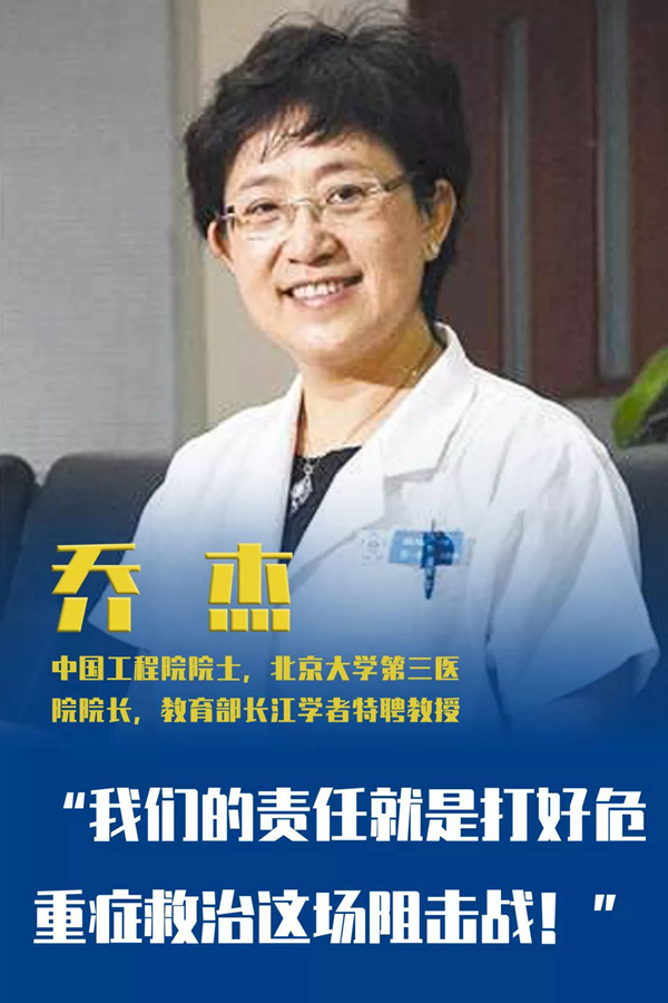 北京大學(xué)自創(chuàng)建以來,始終與國(guó)家和民族同呼吸共命運(yùn)。此次新冠狀病毒感染疫情嚴(yán)重,情況危急。北大迅速派出附屬醫(yī)院的多批醫(yī)療隊(duì)馳援武漢。截止到2月13日,北大援鄂抗疫國(guó)家醫(yī)療隊(duì)已累計(jì)收治危重癥患者200余例,而作為領(lǐng)導(dǎo)組組長(zhǎng),喬杰也已在武漢駐守12天。她協(xié)同各院領(lǐng)導(dǎo)和專家組成員,迅速梳理工作流程,從管理體制建立、到病房改造,再到人員培訓(xùn),儀器設(shè)備調(diào)配,每一細(xì)節(jié)嚴(yán)格把關(guān)。她帶領(lǐng)團(tuán)隊(duì)充分發(fā)揮北大醫(yī)學(xué)多學(xué)科合作優(yōu)勢(shì),為提高新冠肺炎危重患者治愈率,降低病亡率履行著應(yīng)盡的職責(zé)。