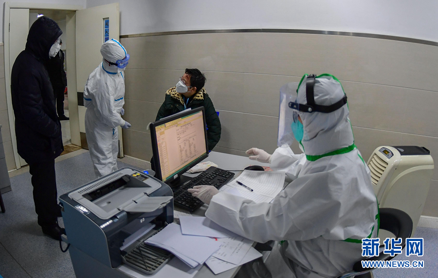 2月1日,在湖北省榮軍醫(yī)院發(fā)熱門(mén)診,醫(yī)生王琴(右一)和護(hù)士劉蕭(左二)接診發(fā)熱患者。 新華社發(fā)(劉中燦 攝)