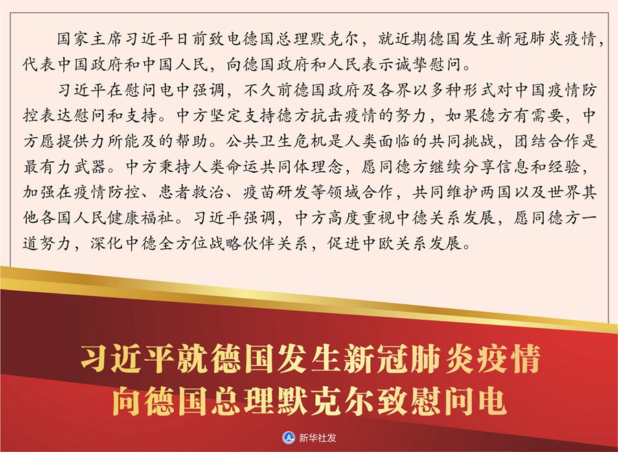 新華社北京3月21日電 國(guó)家主席習(xí)近平日前致電德國(guó)總理默克爾,就近期德國(guó)發(fā)生新冠肺炎疫情,代表中國(guó)政府和中國(guó)人民,向德國(guó)政府和人民表示誠(chéng)摯慰問(wèn)。