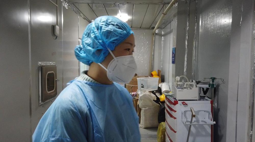 圖為遼寧援助武漢雷神山醫(yī)療隊隊員張倩在隔離病房外等待隊友。