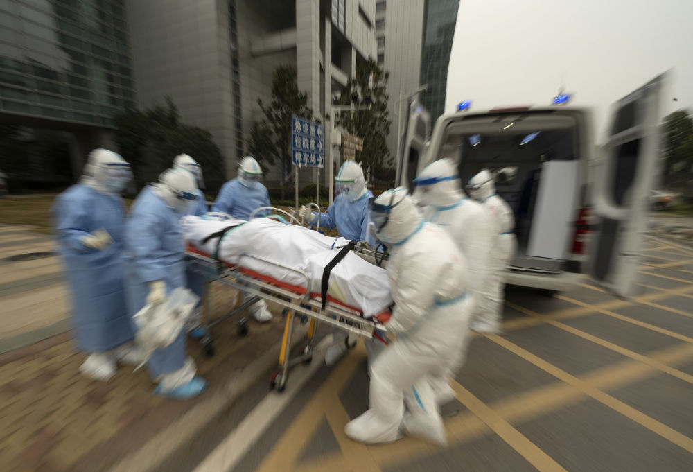 ↑3月6日,在華中科技大學附屬同濟醫(yī)院中法新城院區(qū),醫(yī)護人員護送一名新冠肺炎患者去做CT檢查。