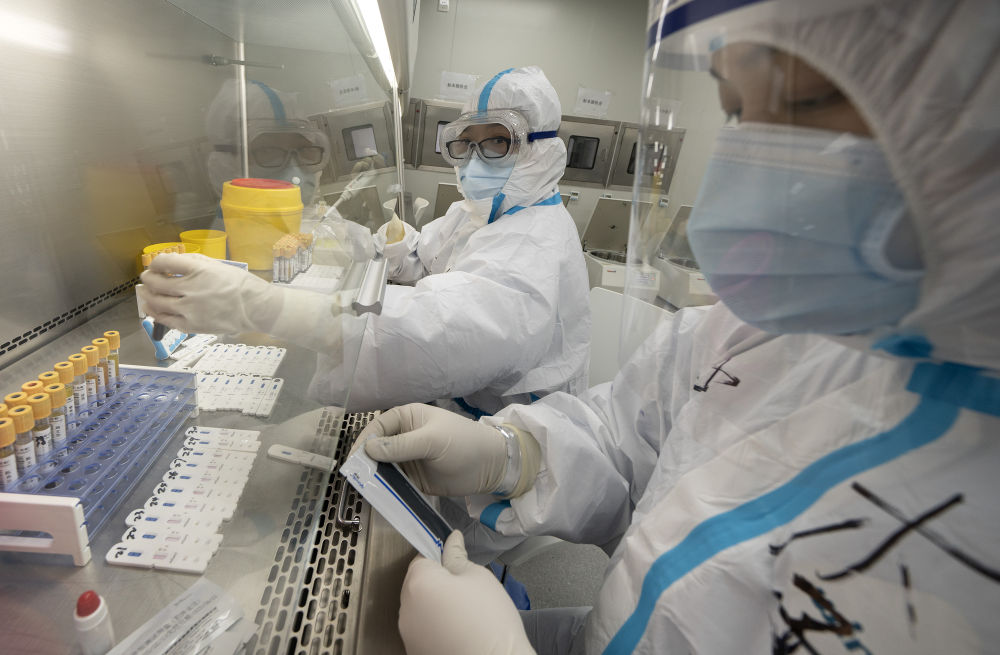 ↑3月4日,在武漢雷神山醫(yī)院醫(yī)學檢驗科,工作人員在對患者的血液樣本進行檢測。