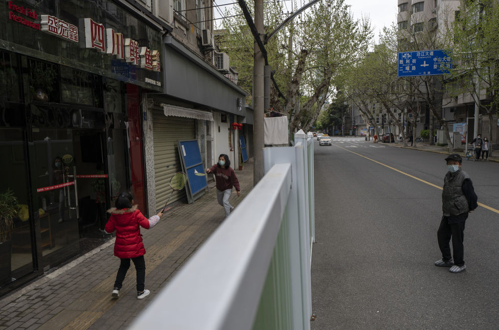 ↑4月1日,在武漢的一個社區(qū)里,人們在隔離墻內(nèi)打打羽毛球。