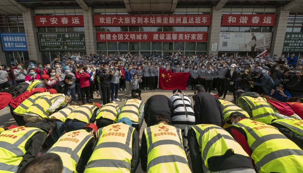 ↑3月19日,在河南醫(yī)療隊駐地,工作人員、志愿者和酒店職工鞠躬感謝即將踏上歸程的河南醫(yī)療隊成員。
