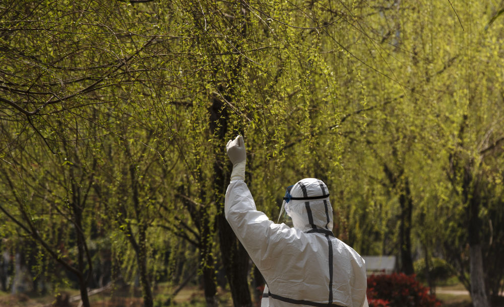 ↑3月14日,在華中科技大學同濟醫(yī)學院附屬同濟醫(yī)院光谷院區(qū),負責新冠病毒肺炎患者轉(zhuǎn)運的云南醫(yī)療隊隊員姚紅軍伸手觸摸剛剛發(fā)芽的柳枝。