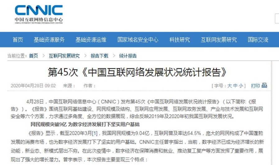 4月28日,中國互聯(lián)網(wǎng)絡信息中心(CNNIC)發(fā)布第45次《中國互聯(lián)網(wǎng)絡發(fā)展狀況統(tǒng)計報告》(以下簡稱:《報告》)?!秷蟾妗穱@互聯(lián)網(wǎng)基礎建設、網(wǎng)民規(guī)模及結構、互聯(lián)網(wǎng)應用發(fā)展、互聯(lián)網(wǎng)政務發(fā)展、產(chǎn)業(yè)與技術發(fā)展和互聯(lián)網(wǎng)安全等六個方面,力求通過多角度、全方位的數(shù)據(jù)展現(xiàn),綜合反映2019年及2020年初我國互聯(lián)網(wǎng)發(fā)展狀況。