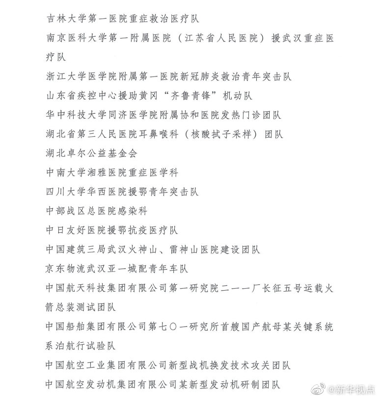 榮獲“中國青年五四獎?wù)录w”的分別是:北汽福田國慶70周年群眾游行彩車底盤制作和技術(shù)保障團(tuán)隊,天津飛騰嵌入式CPU研發(fā)團(tuán)隊,河北醫(yī)科大學(xué)第一醫(yī)院“先心病”愛心團(tuán)隊,太鋼集團(tuán)不銹鋼“手撕鋼”創(chuàng)新研發(fā)團(tuán)隊,哈爾濱工業(yè)大學(xué)紫丁香學(xué)生微納衛(wèi)星團(tuán)隊,諸暨市公安局楓橋派出所,科大訊飛認(rèn)知智能國家重點(diǎn)實驗室創(chuàng)新團(tuán)隊,南昌大學(xué)“稻漁工程”團(tuán)隊,濰柴青年科技創(chuàng)新團(tuán)隊,中國散裂中子源建設(shè)團(tuán)隊,中國航發(fā)渦輪院某發(fā)動機(jī)研制團(tuán)隊,甘肅省無償捐獻(xiàn)遺體器官志愿服務(wù)隊,清華大學(xué)研究生支教團(tuán)青海湟中分隊,73022部隊56分隊,新一代精打體系武器系統(tǒng)青年創(chuàng)新團(tuán)隊,北京大學(xué)援鄂抗疫醫(yī)療隊,中國醫(yī)科大學(xué)新冠肺炎疫情防控醫(yī)療總隊,吉林大學(xué)第一醫(yī)院重癥救治醫(yī)療隊,南京醫(yī)科大學(xué)第一附屬醫(yī)院(江蘇省人民醫(yī)院)援武漢重癥醫(yī)療隊,浙江大學(xué)醫(yī)學(xué)院附屬第一醫(yī)院新冠肺炎救治青年突擊隊,山東省疾控中心援助黃岡“齊魯青鋒”機(jī)動隊,華中科技大學(xué)同濟(jì)醫(yī)學(xué)院附屬協(xié)和醫(yī)院發(fā)熱門診團(tuán)隊,湖北省第三人民醫(yī)院耳鼻喉科(核酸拭子采樣)團(tuán)隊,湖北卓爾公益基金會,中南大學(xué)湘雅醫(yī)院重癥醫(yī)學(xué)科,四川大學(xué)華西醫(yī)院援鄂青年突擊隊,中部戰(zhàn)區(qū)總醫(yī)院感染科,中日友好醫(yī)院援鄂抗疫醫(yī)療隊,中國建筑三局武漢火神山、雷神山醫(yī)院建設(shè)團(tuán)隊,京東物流武漢亞一城配青年車隊,中國航天科技集團(tuán)有限公司第一研究院二一一廠長征五號運(yùn)載火箭總裝測試團(tuán)隊,中國船舶集團(tuán)有限公司第七〇一研究所首艘國產(chǎn)航母某關(guān)鍵系統(tǒng)系泊航行試驗隊,中國航空工業(yè)集團(tuán)有限公司新型戰(zhàn)機(jī)換發(fā)技術(shù)攻關(guān)團(tuán)隊,中國航空發(fā)動機(jī)集團(tuán)有限公司某新型發(fā)動機(jī)研制團(tuán)隊。