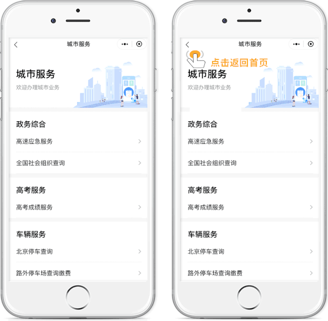 城市服務還會根據定位城市,為你智能化推薦當地的實用功能,如停車查詢、汽車售票、舉報中心等服務,讓你的出行更省心。(如定位有誤可在首頁左上角進行切換。)