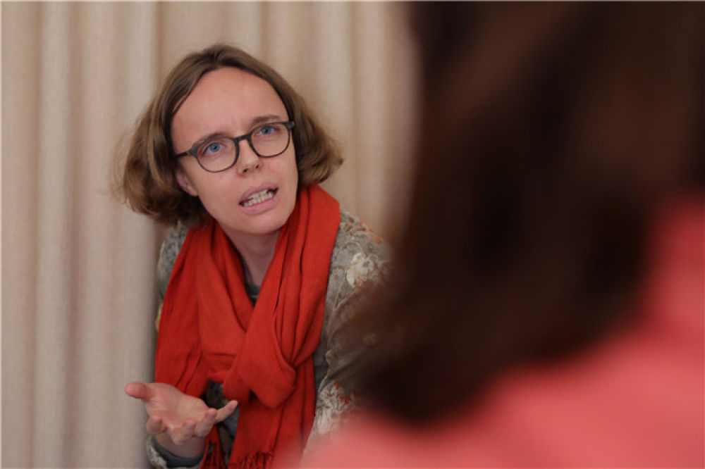 安可悅在位于西寧的心理咨詢工作室輔導一名來訪者(2019年10月22日攝)。新華社記者 趙玉和 攝