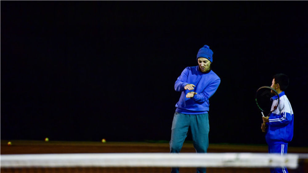 在青海省海東市互助土族自治縣的網(wǎng)球場內(nèi),喬西·羅賓遜(左)在指導學員發(fā)球(2019年11月7日攝)。新華社記者 吳剛 攝