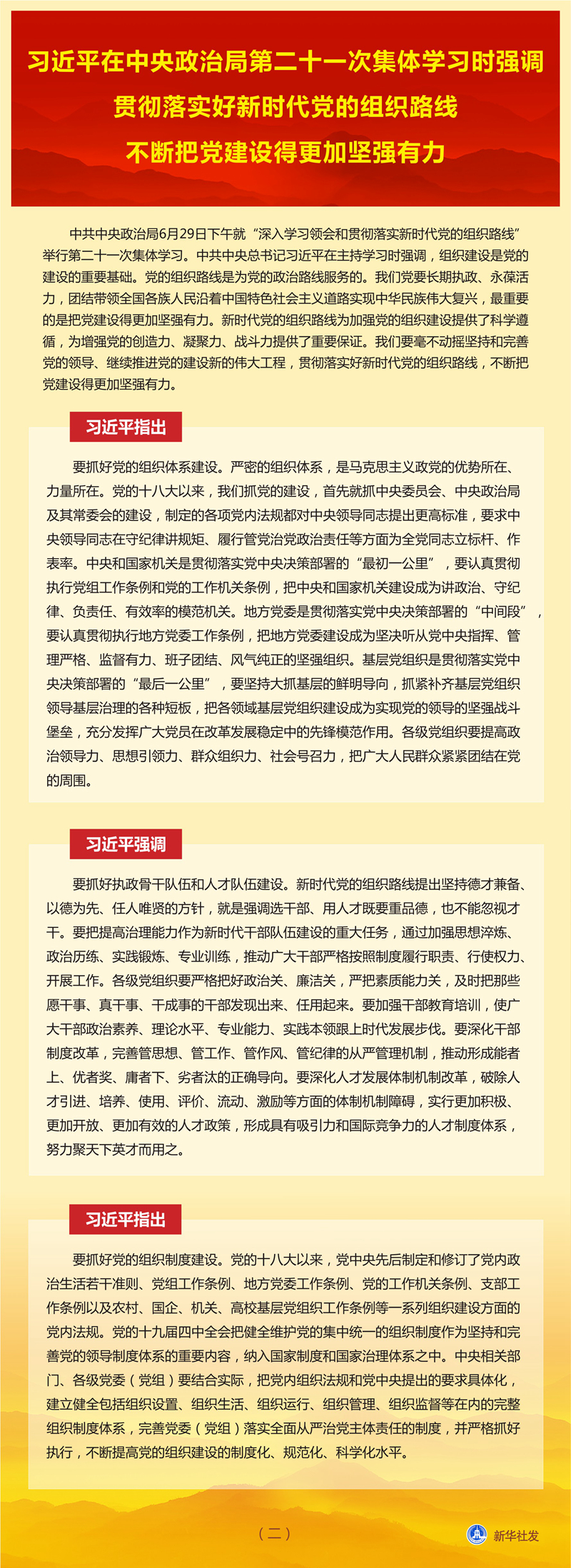 新華社北京6月30日電 中共中央政治局6月29日下午就“深入學(xué)習(xí)領(lǐng)會和貫徹落實新時代黨的組織路線”舉行第二十一次集體學(xué)習(xí)。中共中央總書記習(xí)近平在主持學(xué)習(xí)時強調(diào),組織建設(shè)是黨的建設(shè)的重要基礎(chǔ)。黨的組織路線是為黨的政治路線服務(wù)的。我們黨要長期執(zhí)政、永葆活力,團結(jié)帶領(lǐng)全國各族人民沿著中國特色社會主義道路實現(xiàn)中華民族偉大復(fù)興,最重要的是把黨建設(shè)得更加堅強有力。新時代黨的組織路線為加強黨的組織建設(shè)提供了科學(xué)遵循,為增強黨的創(chuàng)造力、凝聚力、戰(zhàn)斗力提供了重要保證。我們要毫不動搖堅持和完善黨的領(lǐng)導(dǎo)、繼續(xù)推進黨的建設(shè)新的偉大工程,貫徹落實好新時代黨的組織路線,不斷把黨建設(shè)得更加堅強有力。