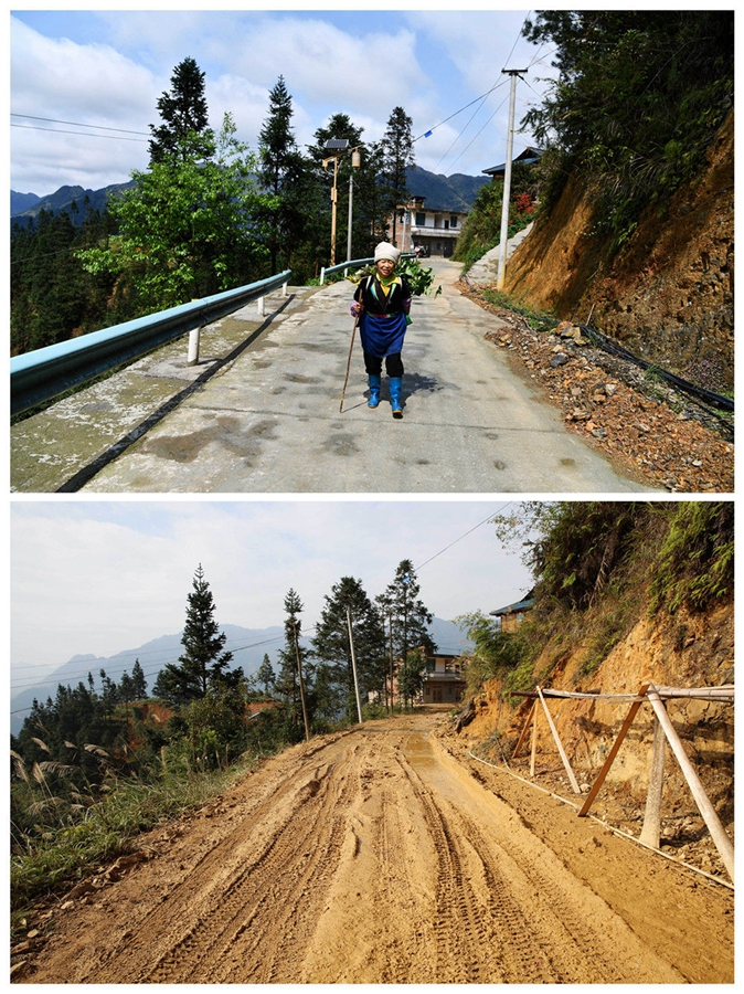 拼版照片的上圖為2020年3月31日,下地勞作歸來的村民走在貴州省從江縣加勉鄉(xiāng)真由村新修的通村公路上(新華社記者 楊文斌 攝);下圖為2016年12月3日拍攝的從江縣加勉鄉(xiāng)真由村的通村道路(貴州橋梁集團供圖)。新華社發(fā)