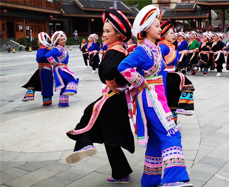 貴州省晴隆縣阿妹戚托藝術團團長文安梅(前左)在領舞(6月9日攝)。新華社記者 齊健 攝