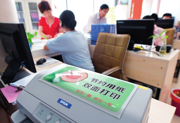 合肥市蜀山區(qū)文博苑社區(qū)的打印機(jī)貼著“節(jié)約用紙 雙面打印”的標(biāo)識 郭晨攝 / 本刊