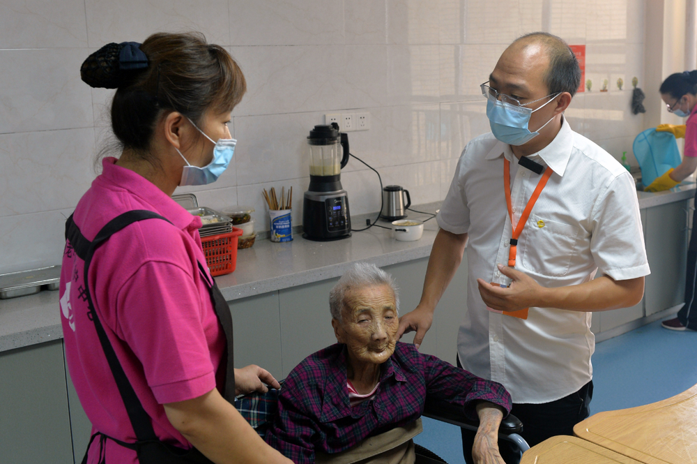 老年人能力評估師王帝權(quán)(右)在和護理人員交流老人的飲食狀況 新華社記者 戚曉毅 攝