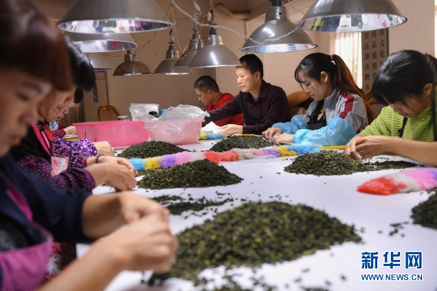 10月27日,在福建省安溪縣感德鎮(zhèn)槐川村的慶蕓茶葉專業(yè)合作社,合作社理事長(zhǎng)陳慶云(右三)和工人在分揀鐵觀音茶葉。新華社記者 宋為偉 攝