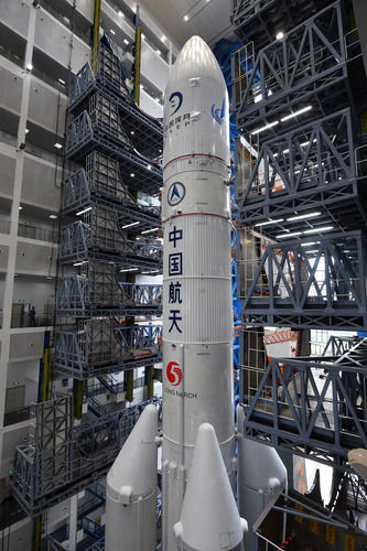 這是11月17日在中國(guó)文昌航天發(fā)射場(chǎng)拍攝的長(zhǎng)征五號(hào)遙五運(yùn)載火箭。新華社記者 郭程 攝