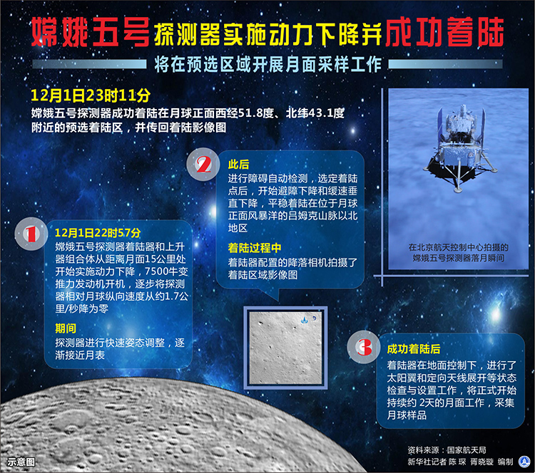 圖表:嫦娥五號(hào)探測器實(shí)施動(dòng)力下降并成功著陸 將在預(yù)選區(qū)域開展月面采樣工作 新華社記者 陳琛 編制