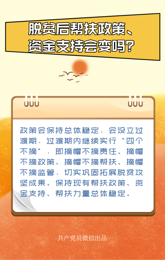 經(jīng)過8年持續(xù)奮斗,我們?nèi)缙谕瓿闪诵聲r代脫貧攻堅目標任務,現(xiàn)行標準下農(nóng)村貧困人口全部脫貧,貧困縣全部摘帽,消除了絕對貧困和區(qū)域性整體貧困,近1億貧困人口實現(xiàn)脫貧,取得了令全世界刮目相看的重大勝利。脫貧后是不是就沒有貧困問題了?脫貧后幫扶政策、資金支持會變嗎?萬一返貧,怎么辦?這些大家最關(guān)心的問題,都有明確答案。