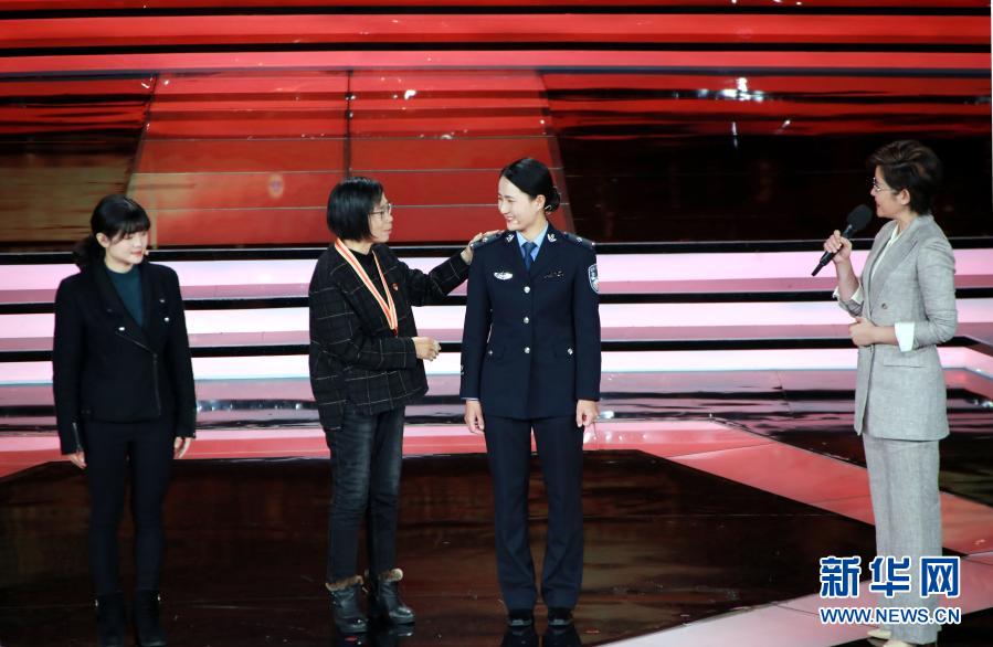 張桂梅(左二)在“時(shí)代楷模”發(fā)布儀式上介紹自己的兩名學(xué)生(12月7日攝)。新華社記者 潘旭 攝