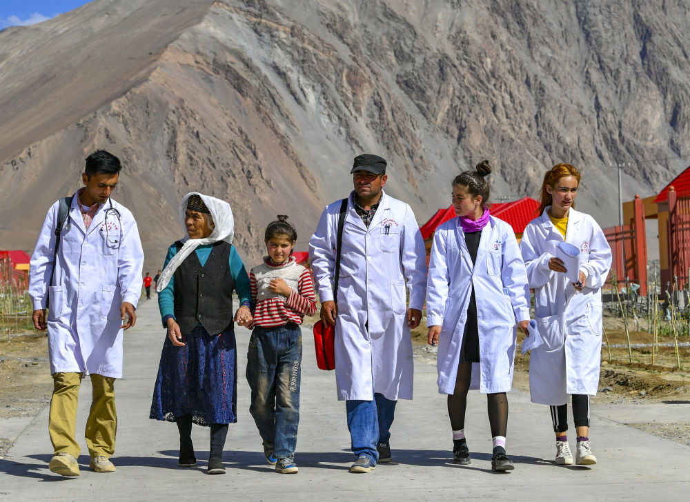 新疆塔什庫(kù)爾干塔吉克自治縣達(dá)布達(dá)爾鄉(xiāng)熱斯喀木村村醫(yī)發(fā)爾亞特·塔西白克(右三)與醫(yī)務(wù)人員來(lái)到當(dāng)?shù)匾椎胤鲐毎徇w安置點(diǎn)出診(2019年7月7日攝)。新華社記者 胡虎虎 攝