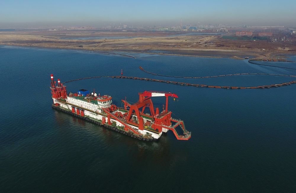 3月14日,一艘施工船在唐山港京唐港區(qū)25萬(wàn)噸級(jí)航道工程海域施工作業(yè)(無(wú)人機(jī)拍攝)。新華社記者楊世堯攝