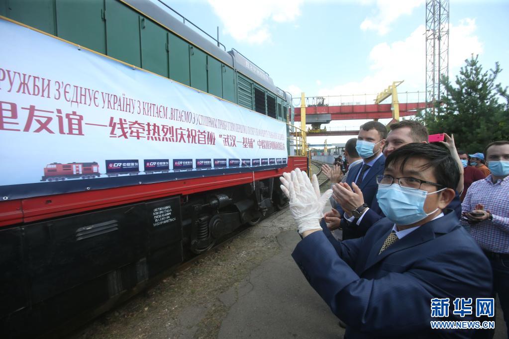 2020年7月6日,在烏克蘭首都基輔市利斯基貨運站,中烏兩國代表迎接“武漢—基輔”中歐班列。該班列是中國華中地區(qū)首列直達烏克蘭的中歐班列。新華社發(fā)(謝爾蓋·斯塔拉斯堅科攝)
