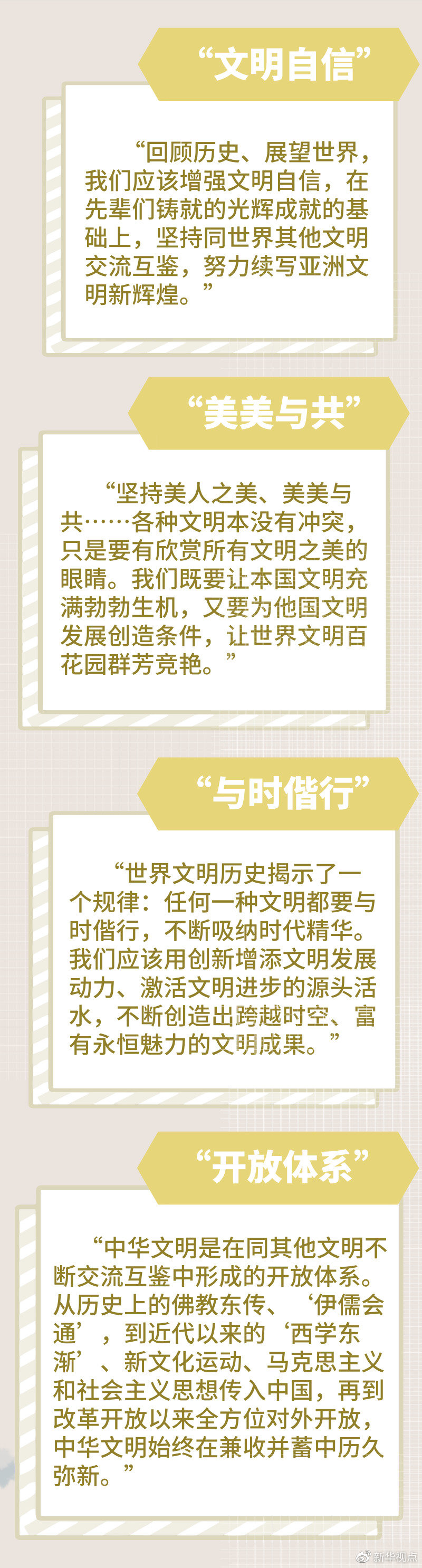 總結(jié)亞洲輝煌的文明成果,闡釋中華文明深刻內(nèi)涵,介紹不同文明“相處之道”,并提出亞洲人民三個(gè)期待和加強(qiáng)世界上不同國(guó)家、不同民族、不同文化交流互鑒的四點(diǎn)主張……