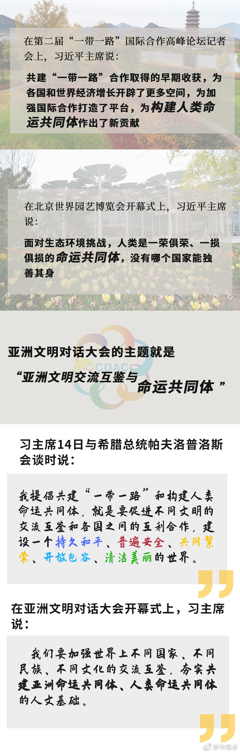 半個(gè)多月來,世界的目光一次次聚焦北京。從第二屆“一帶一路”國(guó)際合作高峰論壇,到2019年中國(guó)北京世界園藝博覽會(huì),再到亞洲文明對(duì)話大會(huì),三場(chǎng)活動(dòng)主題不同,卻有一個(gè)關(guān)鍵詞貫穿始終:命運(yùn)共同體。