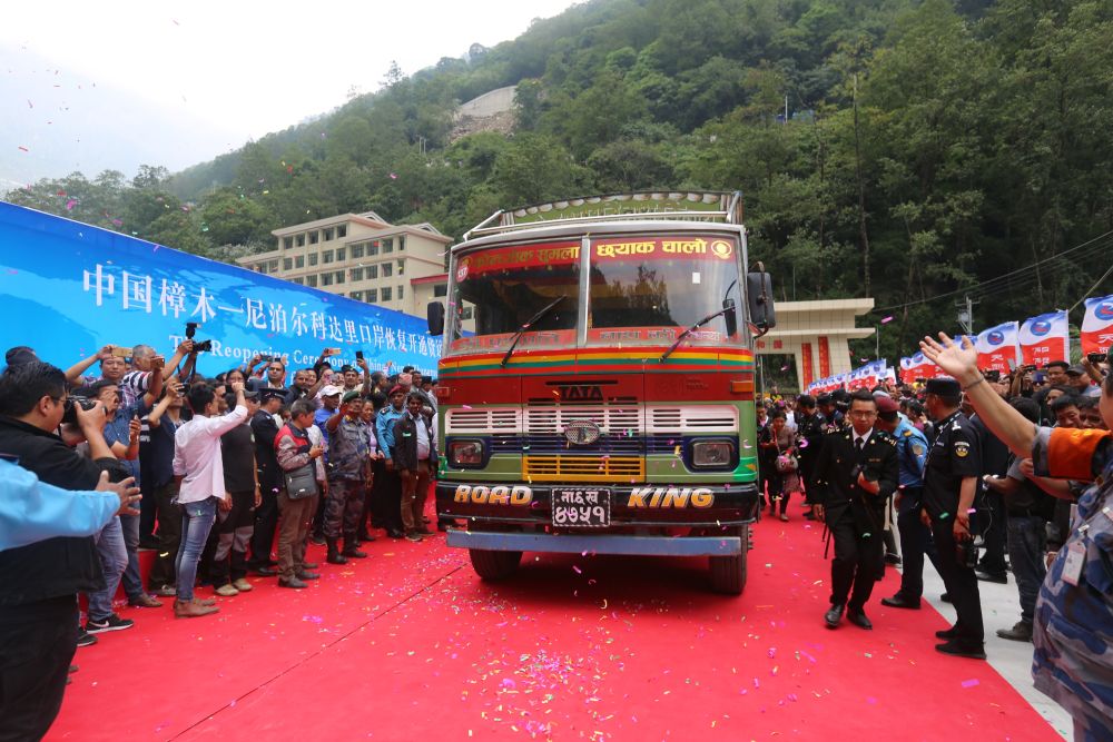 2019年5月29日,一輛尼泊爾貨車滿載貨物駛過連接中國和尼泊爾的友誼橋。新華社記者周盛平攝
