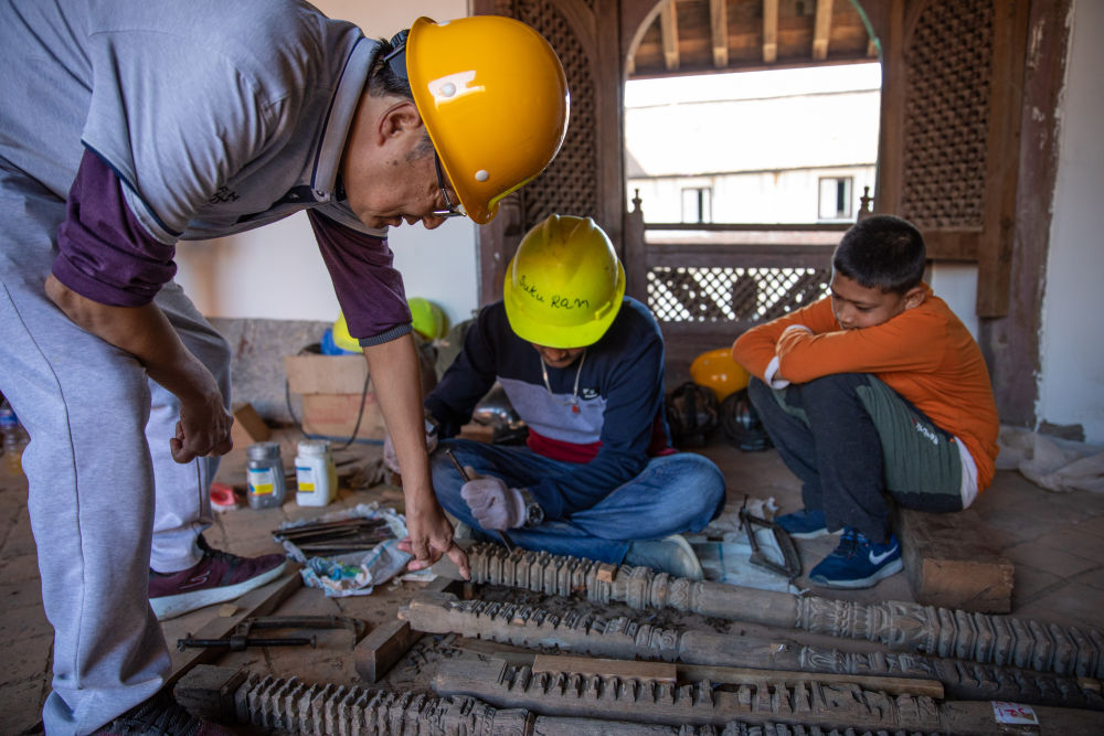 2019年10月10日,在尼泊爾加德滿都杜巴廣場,中國文物修復師周建國(左)在九層神廟修復現(xiàn)場指導尼泊爾工人。新華社記者張可任攝