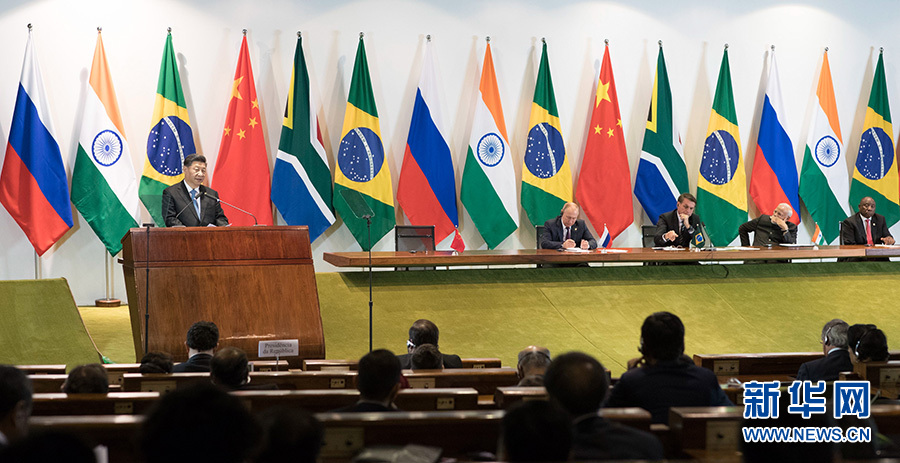 當(dāng)?shù)貢r(shí)間11月14日,金磚國(guó)家領(lǐng)導(dǎo)人同金磚國(guó)家工商理事會(huì)和新開發(fā)銀行對(duì)話會(huì)在巴西利亞舉行。中國(guó)國(guó)家主席習(xí)近平、巴西總統(tǒng)博索納羅、俄羅斯總統(tǒng)普京、印度總理莫迪、南非總統(tǒng)拉馬福薩共同出席。這是習(xí)近平發(fā)表講話。 新華社記者 王曄 攝