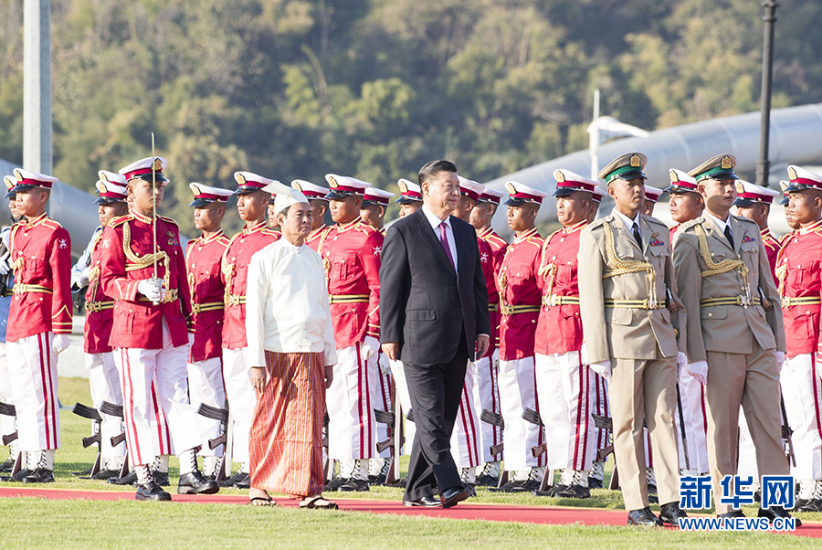 當(dāng)?shù)貢r間1月17日下午,國家主席習(xí)近平在內(nèi)比都總統(tǒng)府出席緬甸總統(tǒng)溫敏舉行的隆重歡迎儀式。這是習(xí)近平在溫敏陪同下檢閱儀仗隊(duì)。 新華社記者 黃敬文 攝