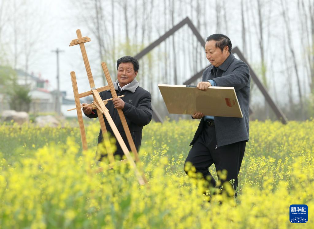 3月21日,当地农民画家潘宇(右)带领农民画培训班的学员在博里镇写生。