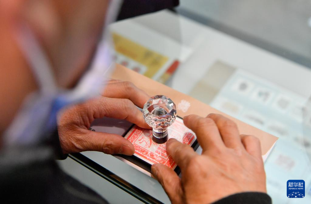 3月23日,在天津邮政博物馆,集邮爱好者在纪念封上加盖纪念戳。