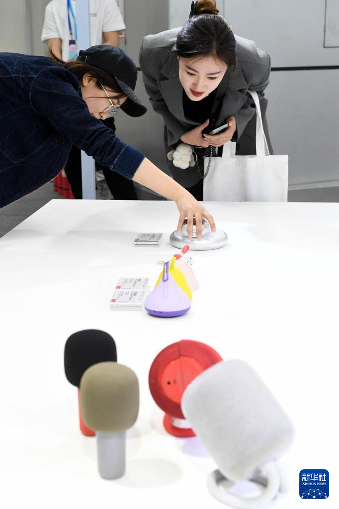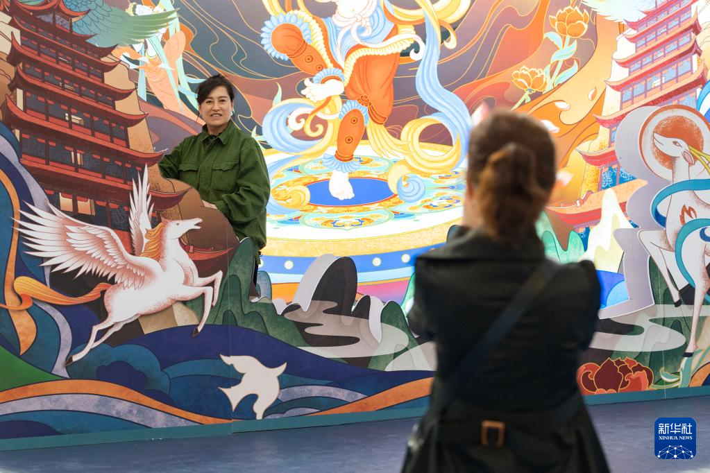5月7日,在哈尔滨国际会展体育中心,观众在首届东北亚文化艺术创意设计博览会上参观拍照。