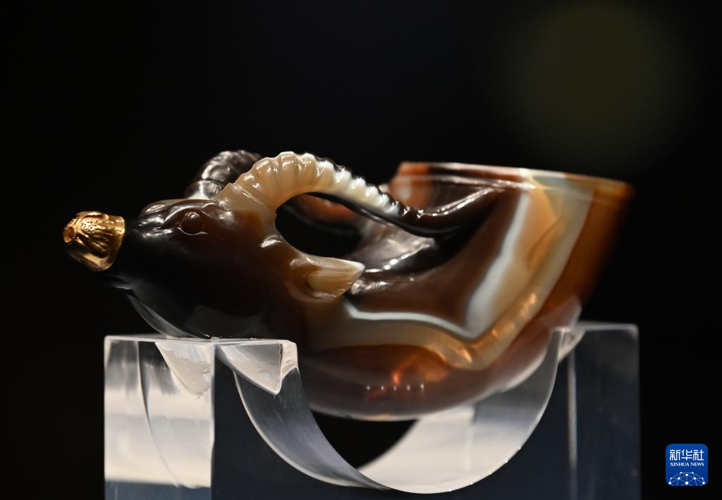 5月11日在陕西历史博物馆拍摄的馆藏唐代文物镶金兽首玛瑙杯。