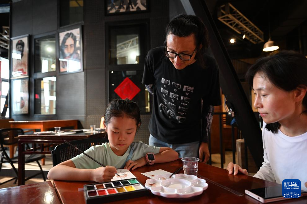 8月5日,市民在艺术课堂上学习非洲鼓演奏。