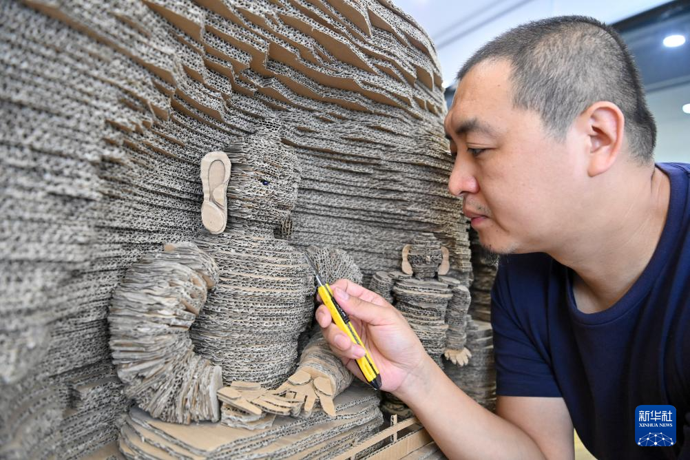王帅栋在位于山西省太原市万柏林区的工作室内修整瓦楞纸作品(8月1日摄)。