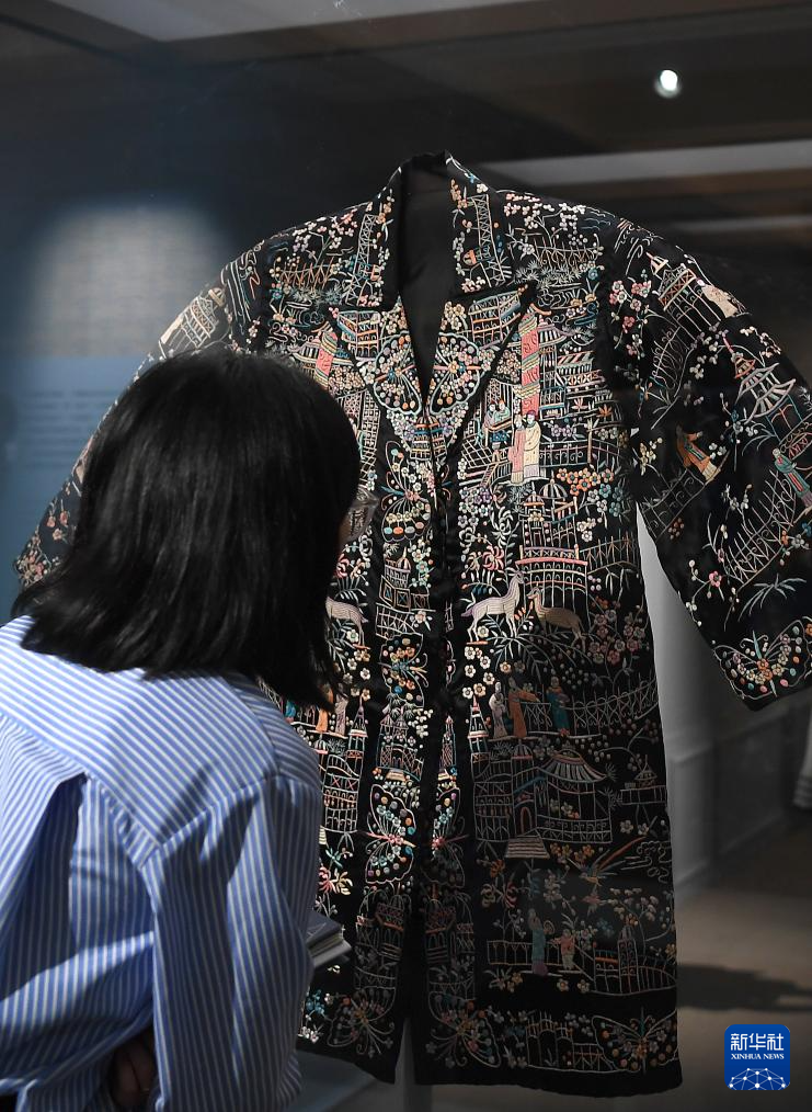 9月7日,媒体记者在展览上观看一款民国时期西式长款女上衣。新华社记者 陈铎 摄