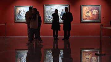 11月26日,参观者在展览现场欣赏春联和福字展品。