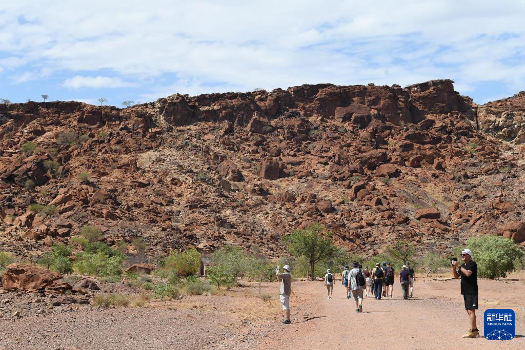 3月26日,在纳米比亚库内内省,游客欣赏颓废方丹岩画。
