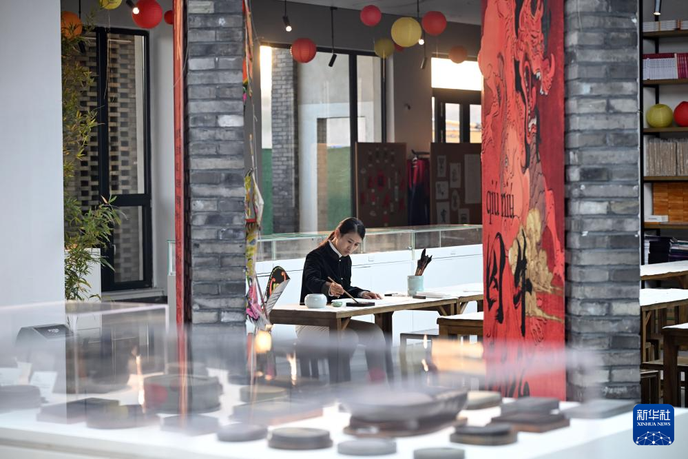 11月25日,邹天然在易水砚艺术馆内写书法。