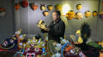 12月9日,西洛在合作社展览厅查看和同事们一起制作的西藏传统面具。