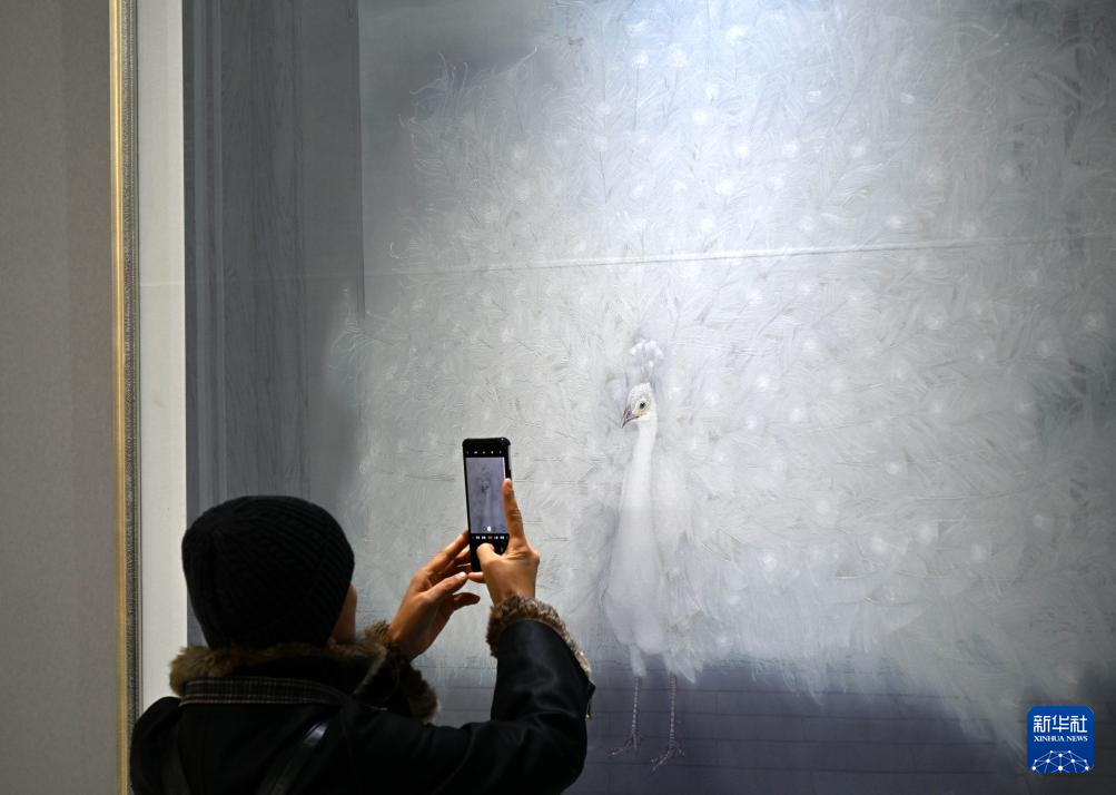 12月15日,观众从一幅动物题材的工笔画作品前经过。