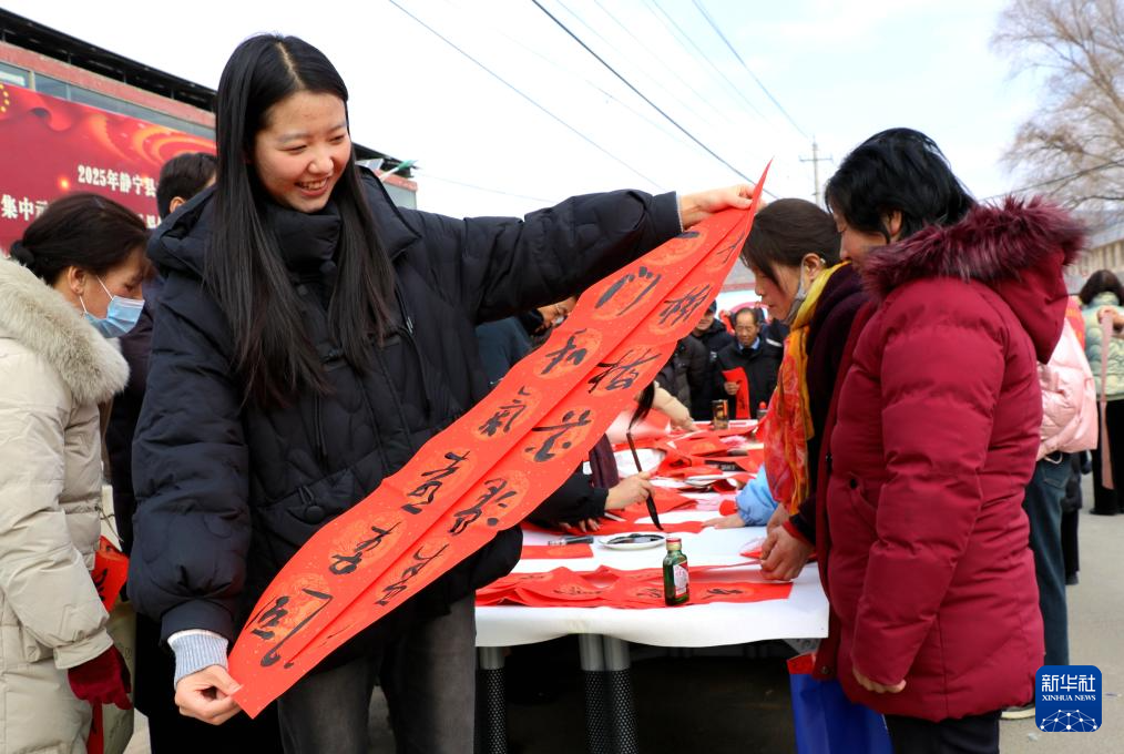 1月21日,在甘肃省平凉市静宁县原安镇齐埂村举行的静宁县文化科技卫生“三下乡”集中示范活动现场,村民喜领志愿者书写的春联。