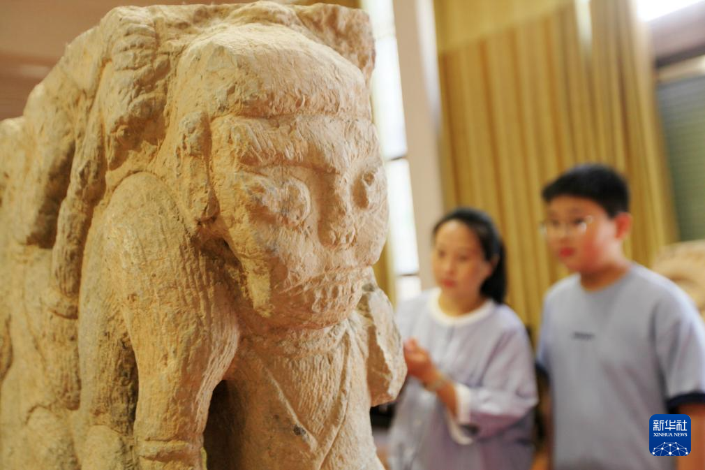 5月18日,游客在山东省临沂市平邑县博物馆参观展出的汉代石刻文物。