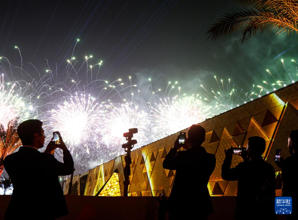 11月1日,人们在埃及吉萨举行的开馆仪式上拍摄烟花和灯光秀表演。